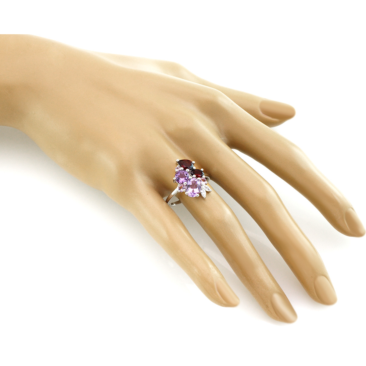Кольцо микс камней из серебра 925 пробы, с родиевым покрытием. Вставка: аметист, гранат, морганит, куб. циркон