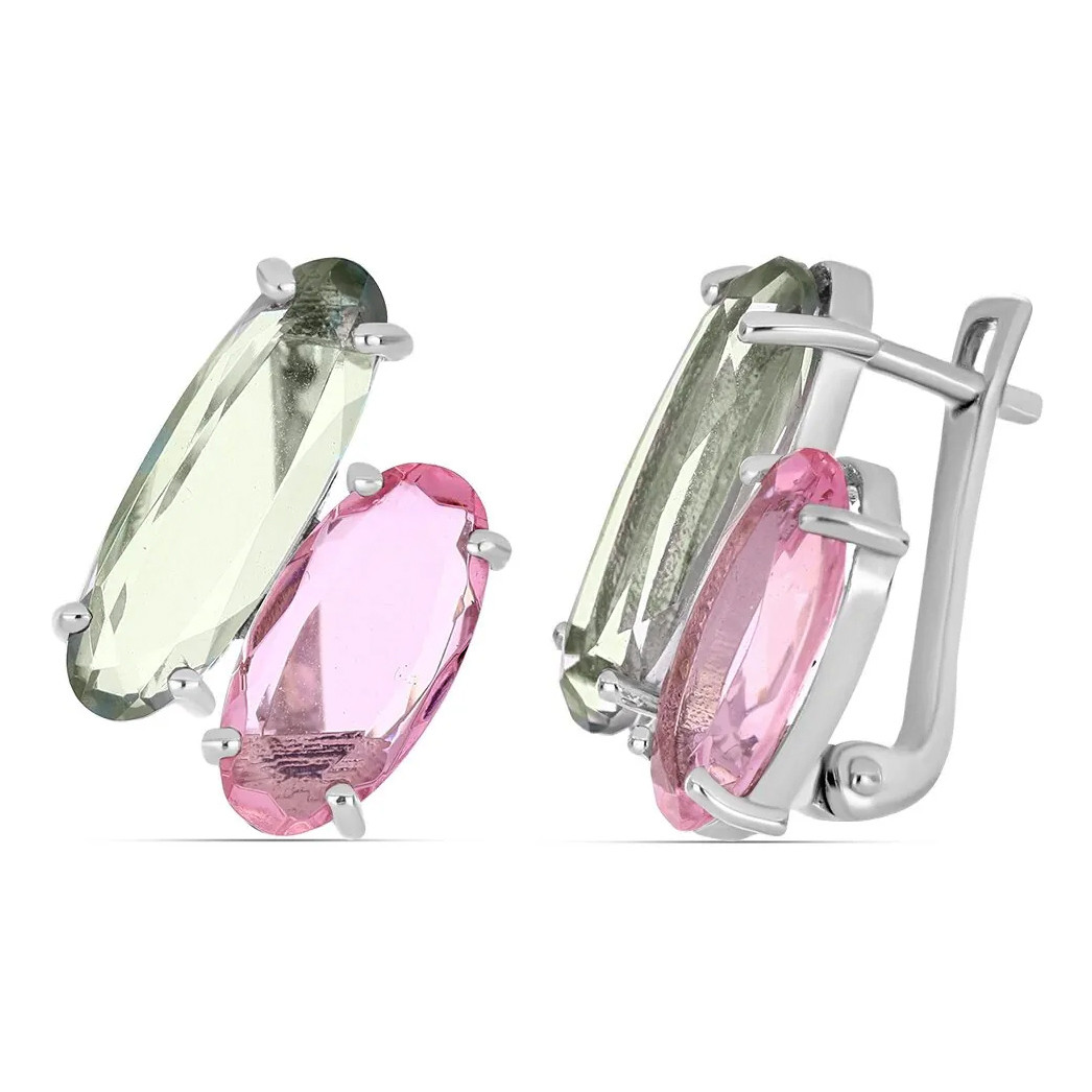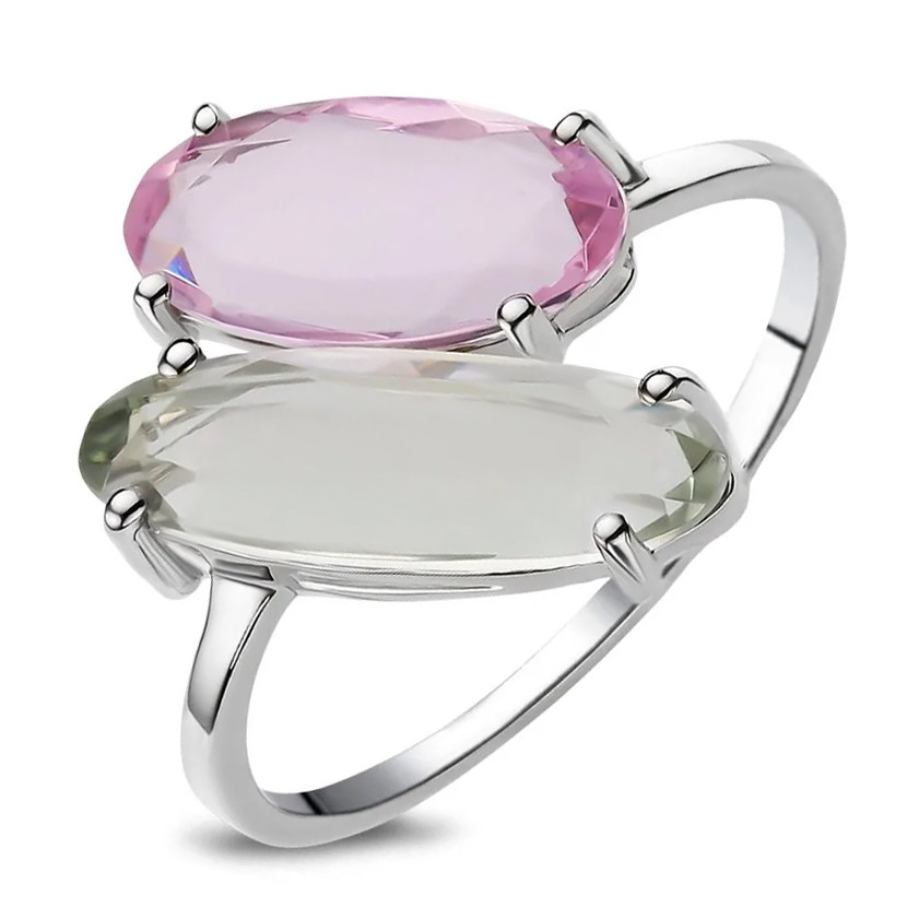 Кольцо микс камней из серебра 925 пробы, с родиевым покрытием. Вставка: морганит, зеленый аметист