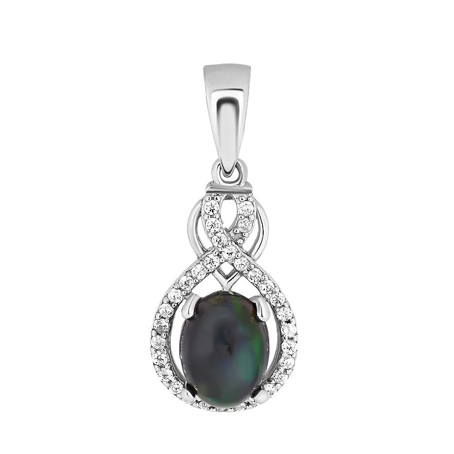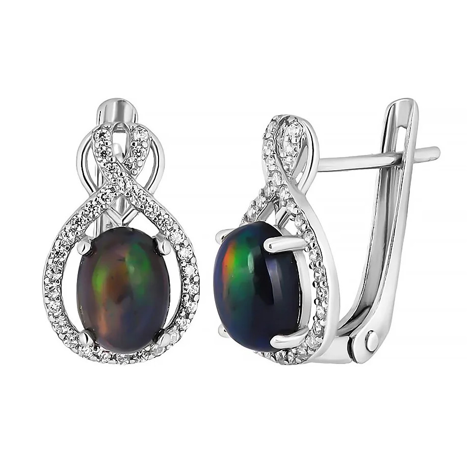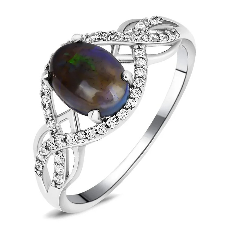 Кольцо с опалом из серебра 925 пробы, с родиевым покрытием. Вставка: опал натуральный черный, куб. циркон.