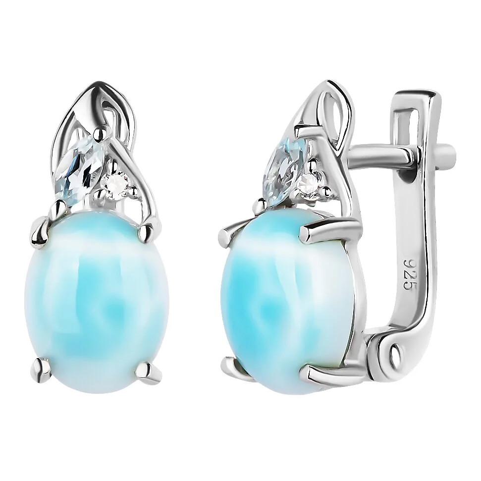 Серьги с ларимаром из серебра 925 пробы, с родиевым покрытием. Вставка: ларимар, топаз.
