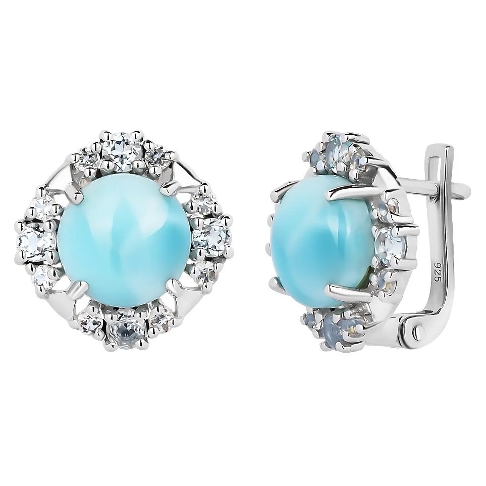 Серьги с ларимаром из серебра 925 пробы, с родиевым покрытием. Вставка: ларимар, топаз.