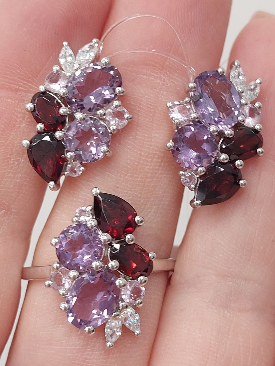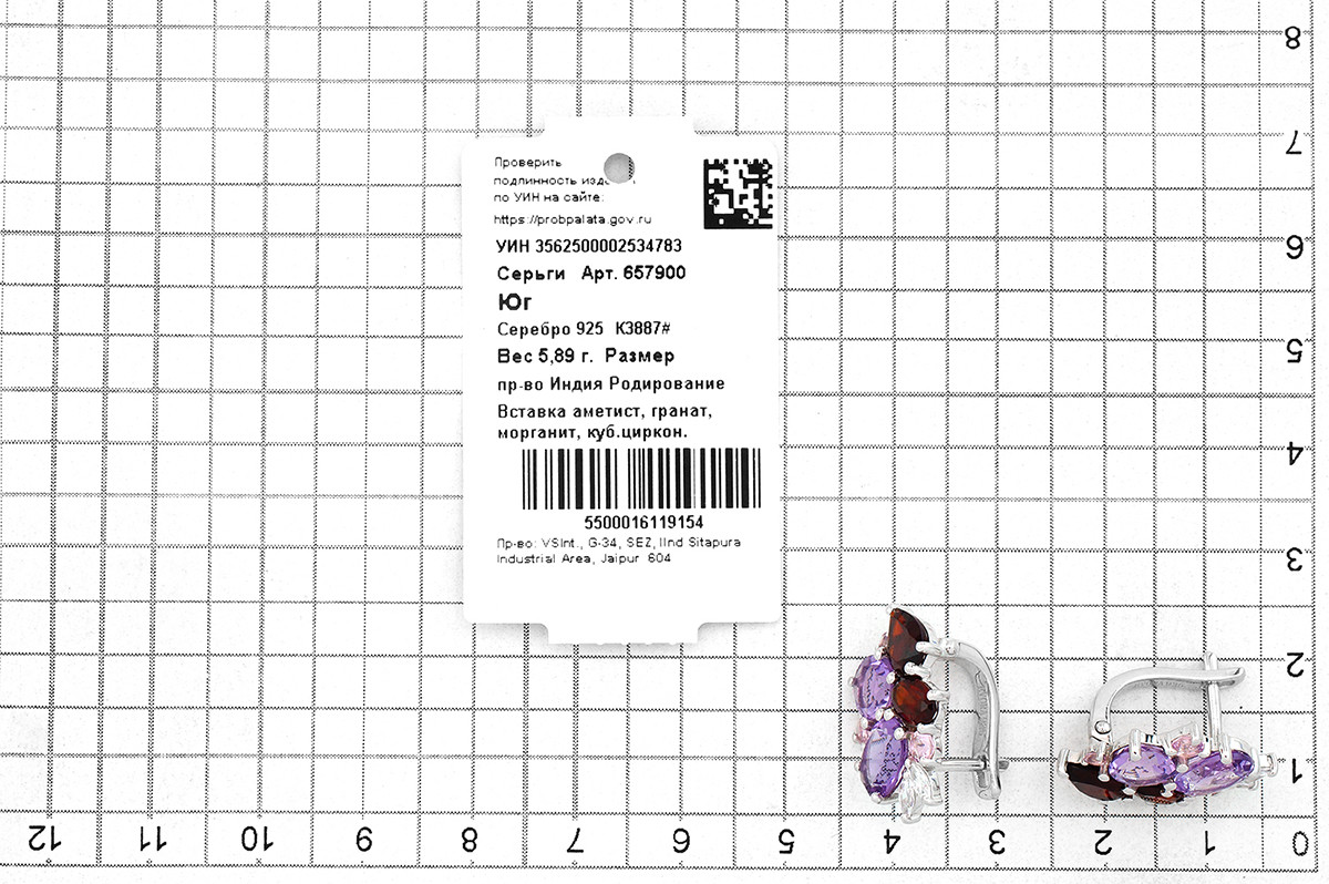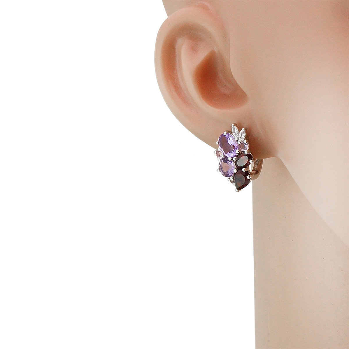 Серьги микс камней из серебра 925 пробы, с родиевым покрытием. Вставка: аметист, гранат, морганит, куб. циркон
