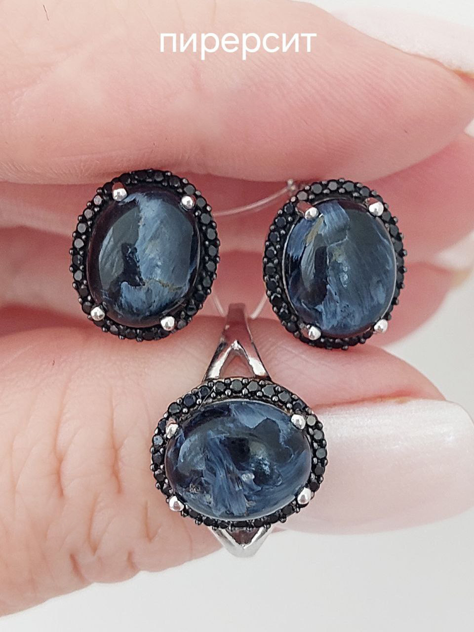 Серьги с питерсит из серебра 925 пробы, с родиевым покрытием. Вставка: питерсит, шпинель.