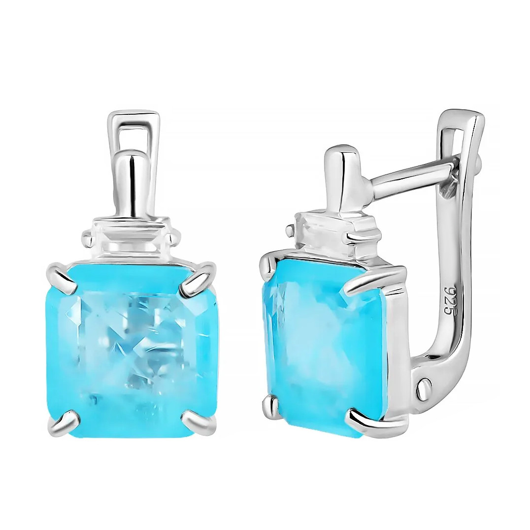 Серьги с турмалином из серебра 925 пробы, с родиевым покрытием. Вставка: турмалин лазурный выращ., куб. циркон.